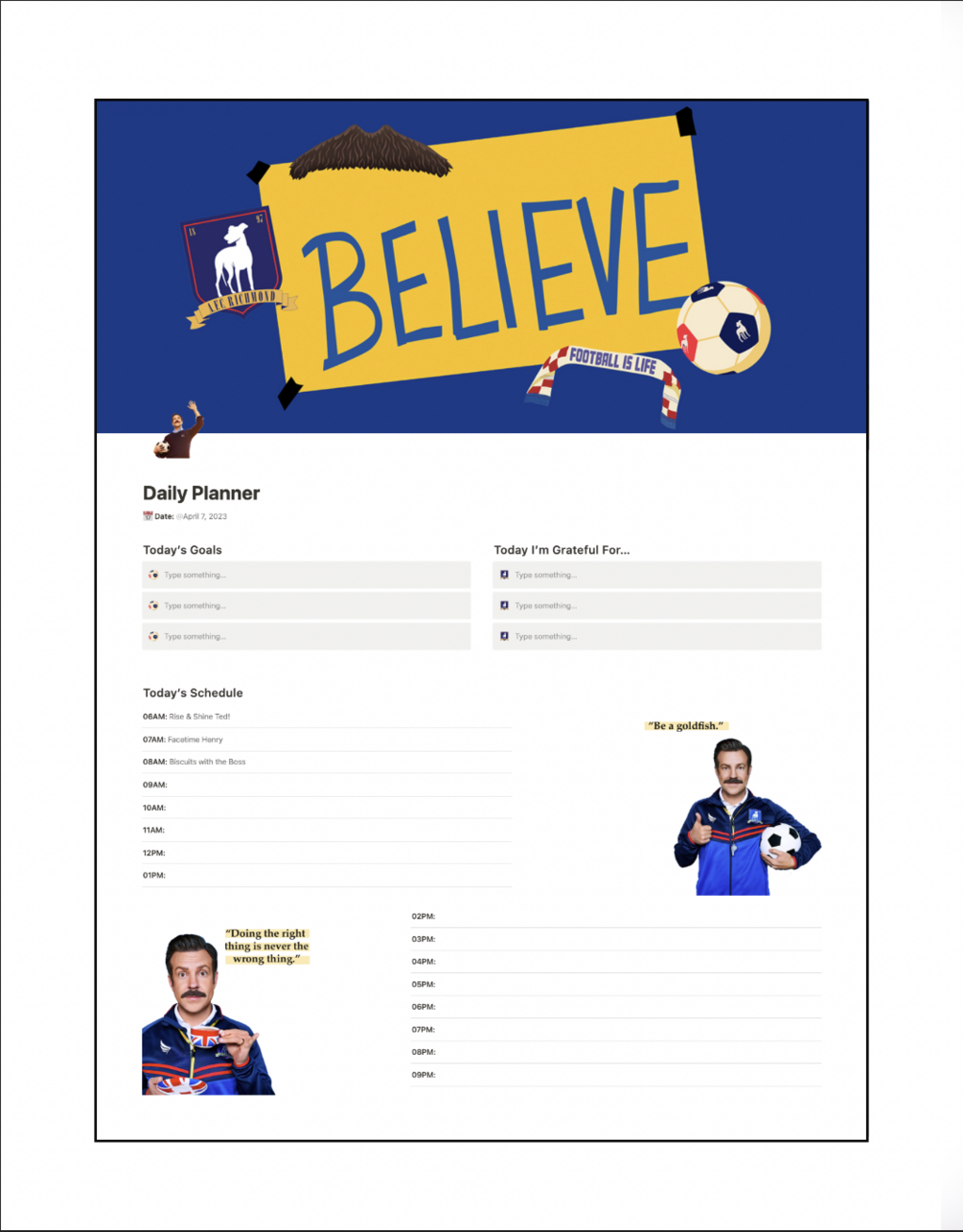 An easy-to-use Ted Lasso themed daily planner Notion template